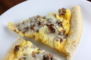 Standard pizza dough is topped with their signature cheese sauce sausage scrambled eggs and cheese. Scramble egg over stop top or in microwave.